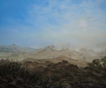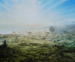 2015Olieverfschilderijen van de Amsterdamse waterleidingduinen in de mist met doorbrekende zon.