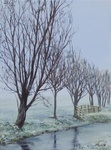 2006Olieverfschilderij van een winters weiland met sloot en knotwilgen.