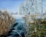 2020Olieverfschilderij van een winterlandschap met een bevroren sloot.
