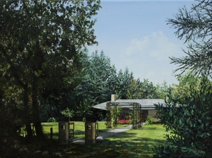 Olieverfschilderijen van huizen in opdracht geschilderd.